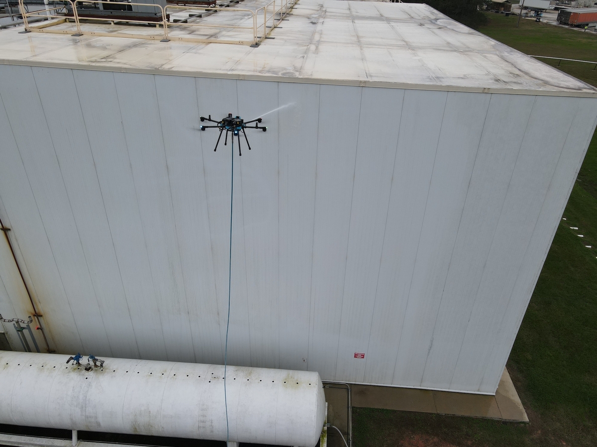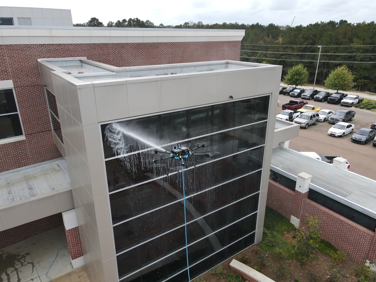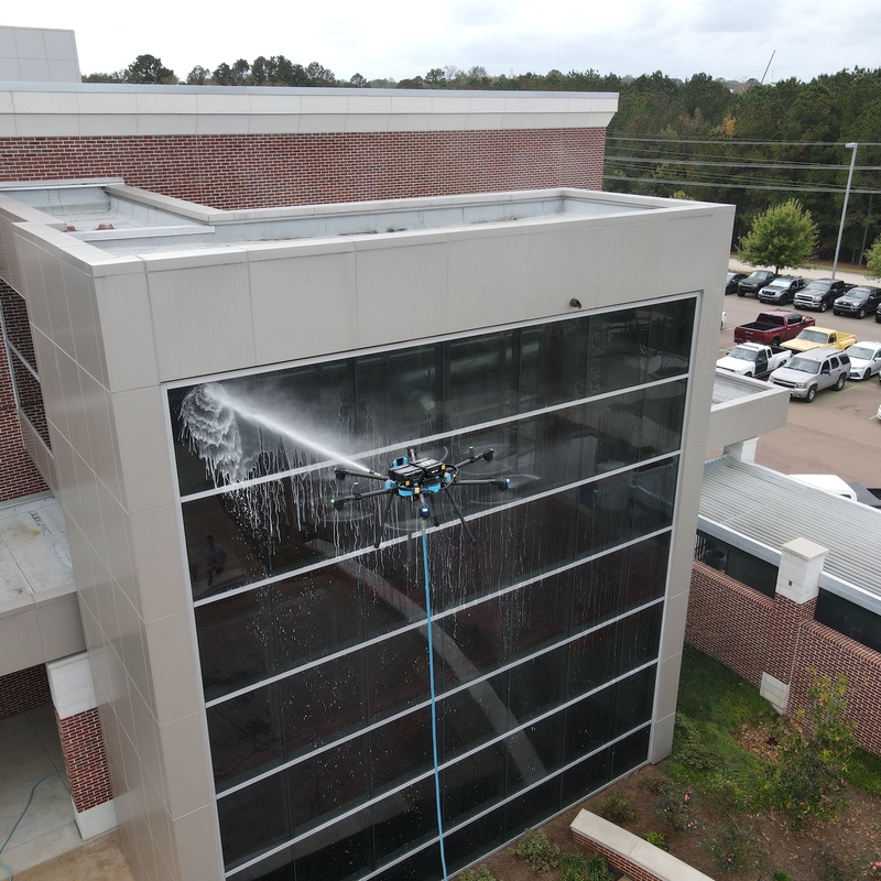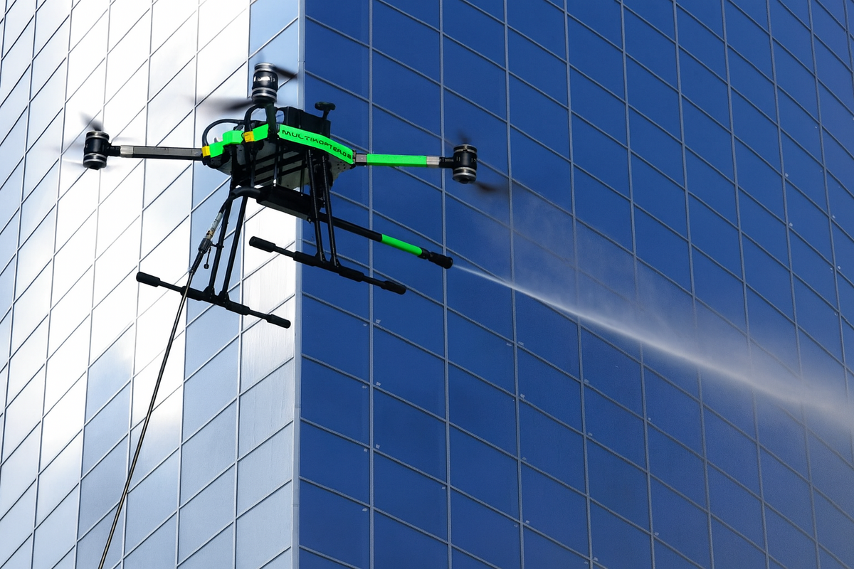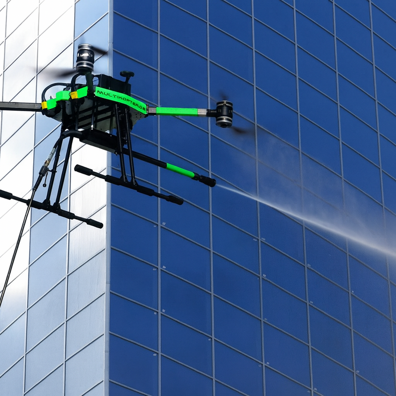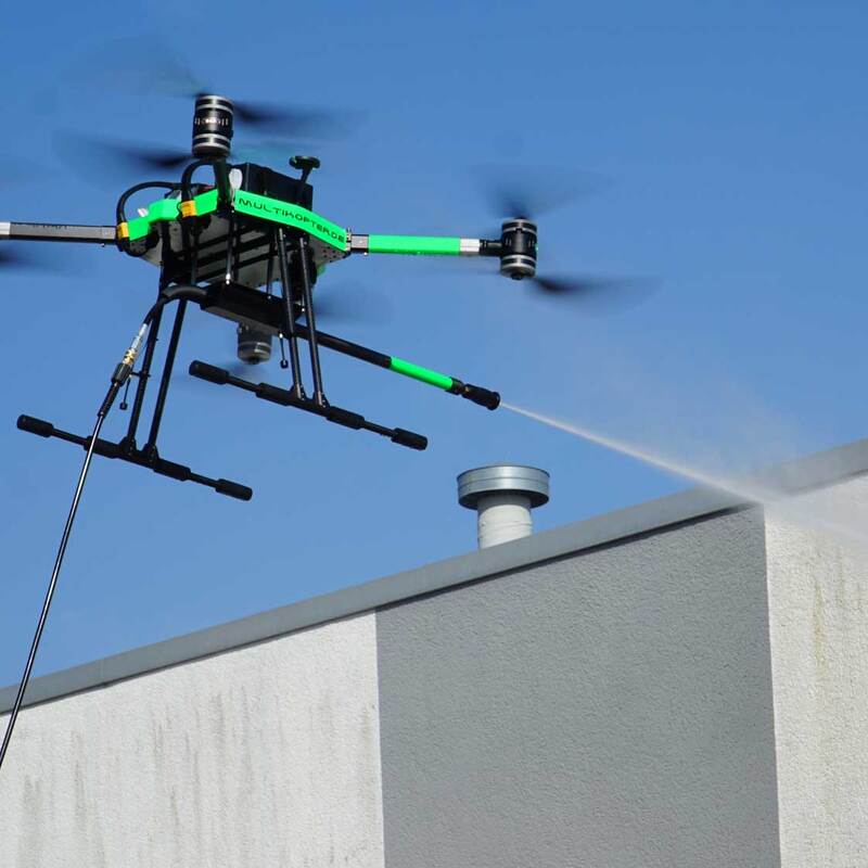 Die Reinigung erfolgt mithilfe speziell ausgestatteter Drohnen, die gezielt schwer erreichbare oder hohe Fassadenbereiche anfliegen und effizient reinigen.