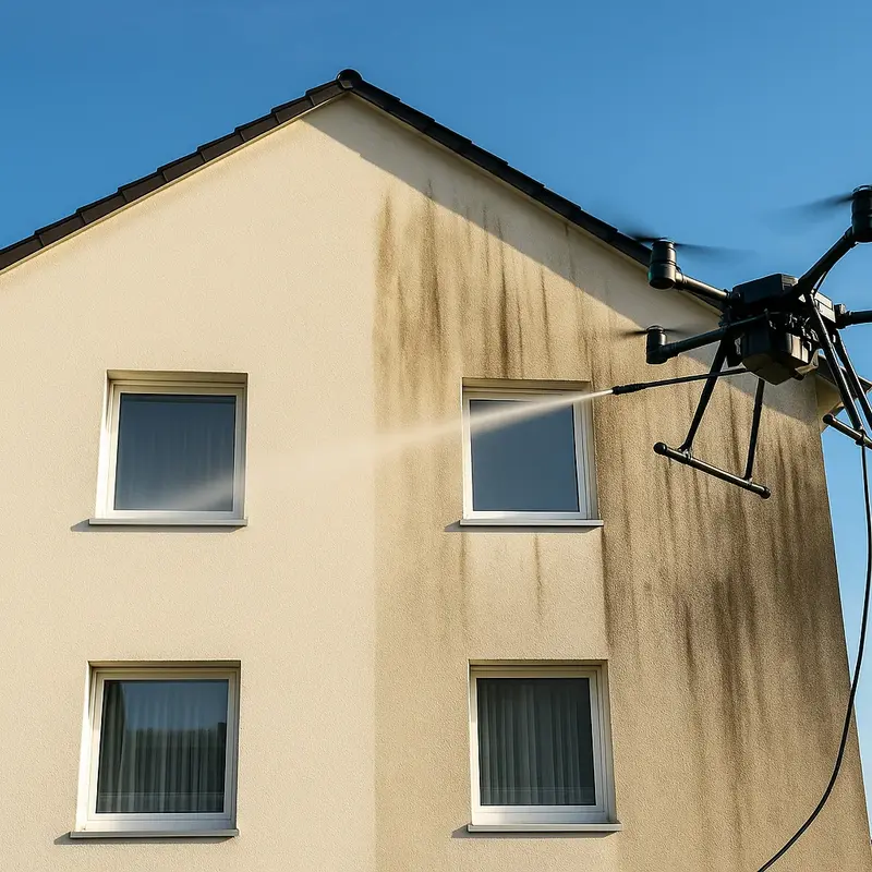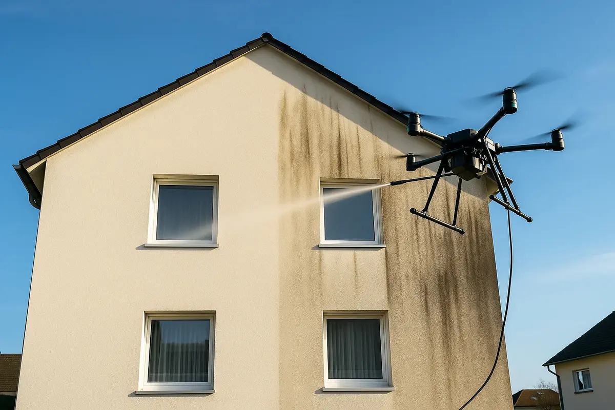 Unsere drohnengestützte Fassadenreinigung kombiniert innovative Technik mit professioneller Ausführung.